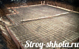 После подготовки опалубки и арматуры заливают плиту фундамента бетоном марки М250-М300, толщина плиты обычно составляет не менее 20 см. Заливку бетона производят по возможности сразу. Возможна заливка отдельными партиями, но при этом прочность плиты уменьшается, и возможно появление швов с повышенным напряжением на разрыв. Стыки бетона при этом лучше располагать вдоль длинной стены.После заливки бетон пробивают с помощью глубинного вибратора и виброрейки, выравнивают его поверхность и оставляют для созревания минимум на 28 суток. Чтобы ускорить скорость строительства, через несколько дней после заливки можно начать возведение опалубки для стен фундамента и цоколя.